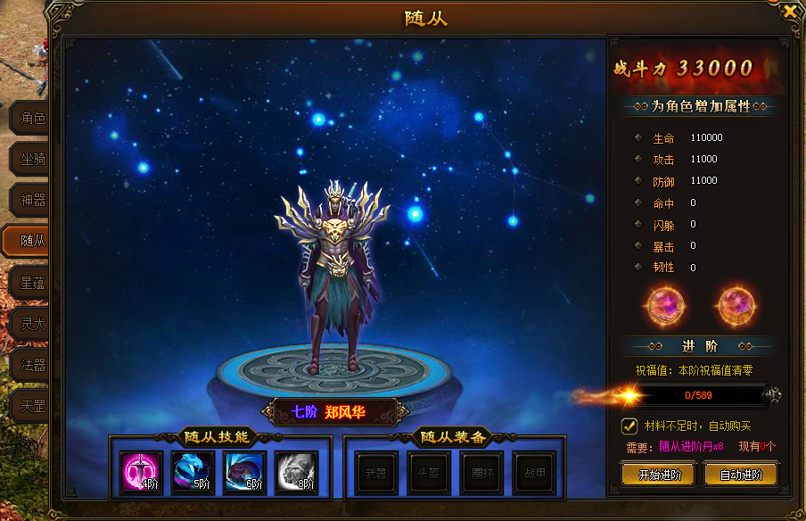 随从进阶需要消耗随从进阶丹,随从等级越高,给角色提升的战斗力越高。