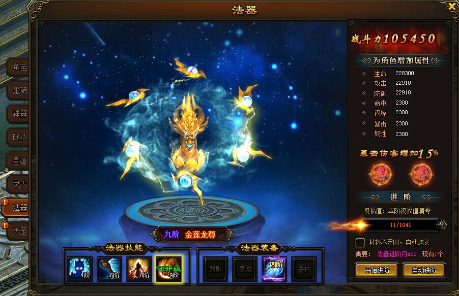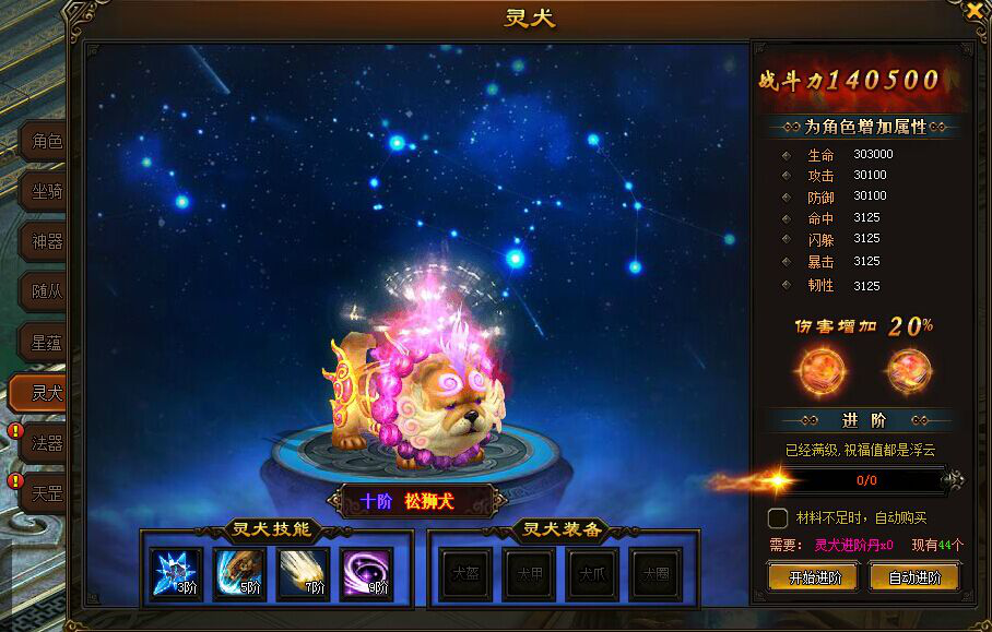 灵犬、法器、天罡进阶需要分别消耗灵犬、法器、天罡的进阶丹,进阶的等级越高,给角色提升的战斗力越高。