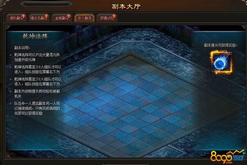 乾坤法阵可以产出大量混元供加速升级元神。乾坤法阵需至少2人组队才可以进入,组队按钮在屏幕右下方。乾坤法阵需至少2人组队才可以进入,组队按钮在屏幕右下方。副本内按照提示即可轻松破解机关。队伍中一人退出副本另一人可以继续挑战,只有去完成挑战的玩家可以获得奖励。