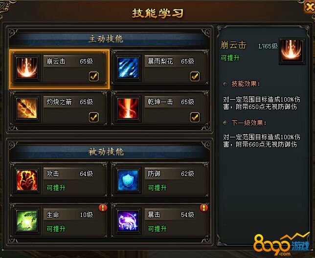 8090欢喜密探页游角色的四项技能等级与角色等级同步,我们需要注意的是被动技能的加点。被动技能加点只消耗金币,其实相对还是非常经济方便的,祈愿和财神副本都可以掉落大量金币,日常刷怪和副本也有很多加成。至于被动技能的四种加成:攻击、暴击、生命、防御。推荐主加攻击和暴击,其次是防御,毕竟金币有限,加点不能一条线端平,而且有一些限时副本的机制,并不允许皮厚高防的玩家花大量时间磨穿副本。