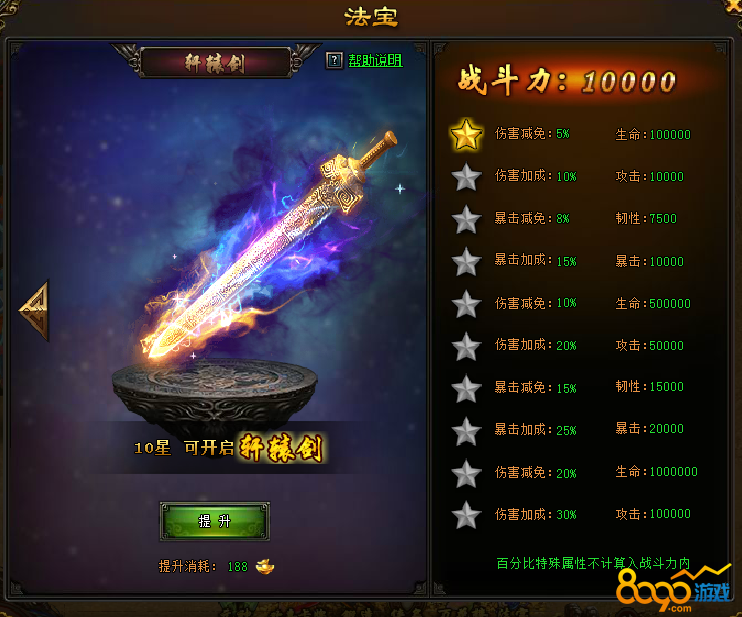 10星提升效果,伤害加成+30%,攻击+10W