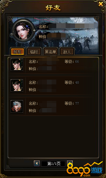8090欢喜密探中包括好友、临时、黑名单、仇人、系统。共5个界面。
