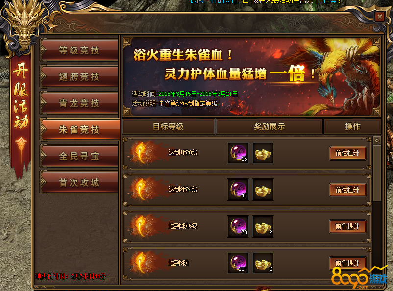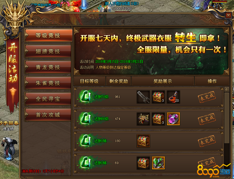3、累计充值10000元宝:青龙大*1、经验玉*1、神羽*10、转生神殿*1、高级boss*1
