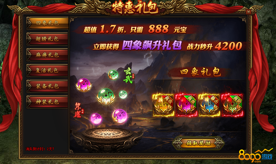 超值1.7折,只需888元宝立即获得四象狂升礼包,战力秒升4200