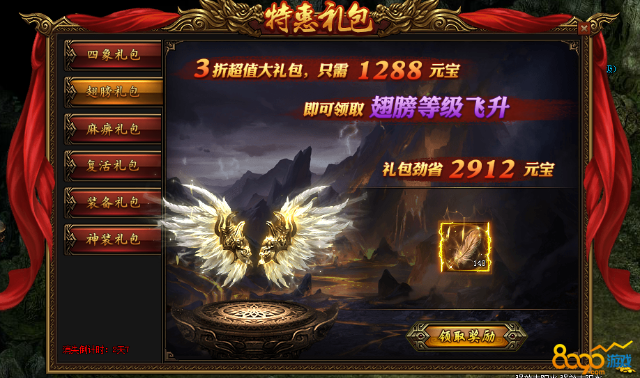 3折超值大礼包,只需1288元宝,即可领取翅膀等级飞升。礼包劲省2912元宝。