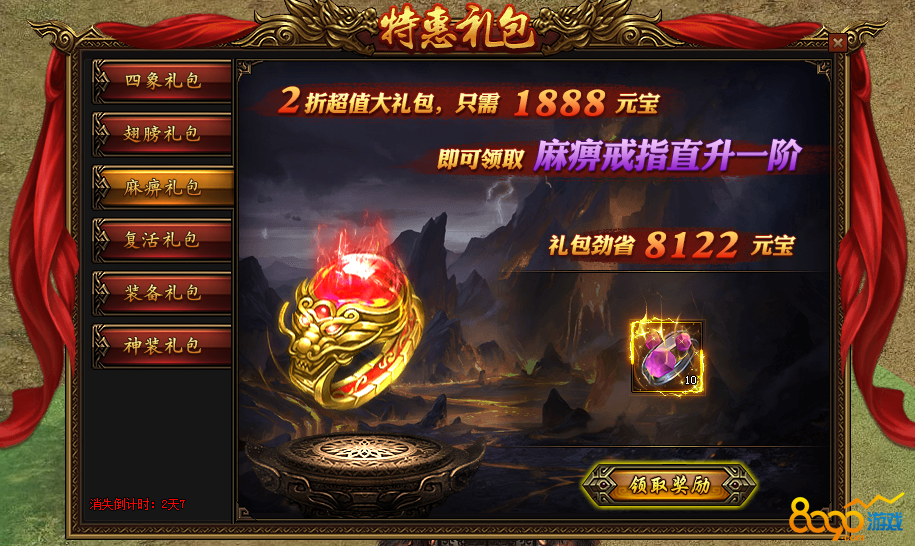 2折超值礼包,只需1888元宝,即可领取麻痹戒指直升一阶,礼包劲省8122元宝