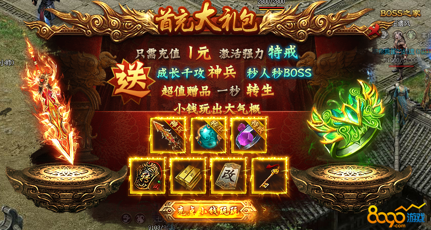 只需充值1元激活强力特戒,送成长千攻神兵,秒人秒boss。超值赠品 一秒转生 小钱玩出大气概。