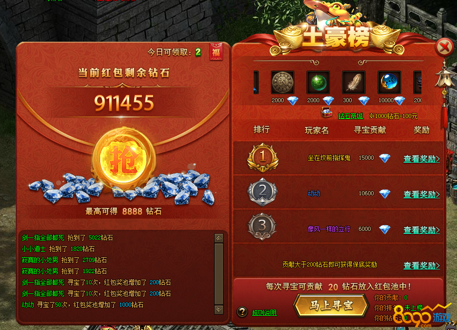 1、累计充值1000元宝:羽毛*48、高级转生丹*1、摸金*1、副本卷轴*5、内功丹*1