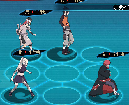 带蝎的打法,能更简单点,基本要求是蝎满血的傀儡扛得住重吾一次普攻,站位如图,火主技能,奥义封印,普攻睡眠,追打豪火球,被动火属性强化,分身记住别开蝎的奥义,一般也别用火主奥义打佐助(会被麻痹),10回合内打死佐助就能过了。