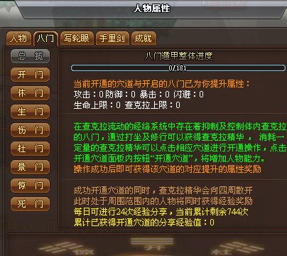在人物属性的界面上方,有1个八门的功能,打开以后是这样的: