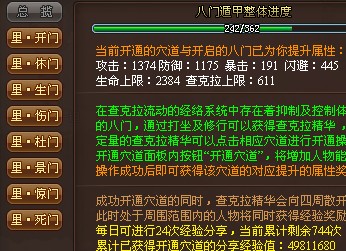 关于八门的东西差不多就到这了,最后是一点是关于八门经验的问题,关于开八门的经验是随着级别加的,级别越高,经验越高,但是开启到里八门,开启的时候经验会多加50%,当然对与分享的人来说也是一样的多50%。魂八门还会再加。