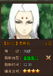 君麻吕:一下就感觉难度增加的可怕,他在游戏中,比白可不是只强一点点,因为他已经开始掉落60级装备,一般60级一下的玩家击杀不了,如果八门开的好 装备不错,宠物也还行,可以去尝试,普通有2300左右的防御带大红就可以抗的了。但是2700的防御也可能会挂掉。从君麻吕开始就不再是只对防御,闪避等要求了,技能也是一个方面,如果技能不好,只有用更高的防御或者是更多的纸鹤来填了。当然有足够高的解印和蛇手,防低也可以击杀。