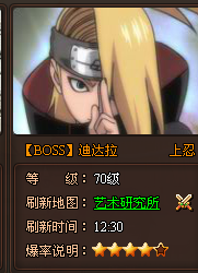 迪达拉:从他开始,BOSS的技能已经不再是简单的封印,崩掌等等了,会有定身,淬毒等等技能的出现,可以说从他开始难度增加了很多,如果没有相关技能,估计抗他普通攻击需要3800-4200左右的防御,如果他出崩掌还是要倒地的,所以这时候蛇手尤其重要,他和50 60 BOSS一样掉落的还是60的装备,这个估计因为60-80的时间比较长。