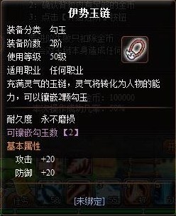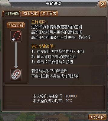 一阶的玉链花费10W金币就可以升级到二阶。10W在前期来说可能是一个天文数字,但是对于拥有玉链、勾玉的玩家来说这个花费应该说是很少啊。二阶的玉链可以增加20的攻击。