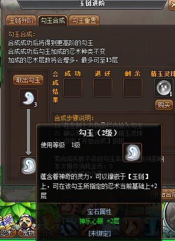 升级勾玉跟宝石合成是类似的,不过勾玉合成需要购买一个精玉灵珠才能进行合成。