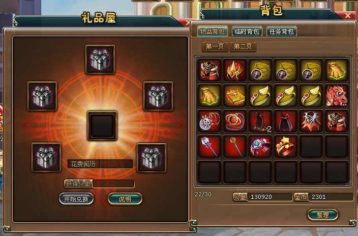 礼品屋背包中有物品背包,临时背包,任务背包。这些背包有第一页,第二页,礼品屋花费阅历开始兑换。