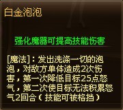 魔法:发出洗涤一切的泡泡,对敌方单体造成2次伤害,第一次降低目标25点怒气,第二次使目标无法积累怒气2回合(技能可被格挡)