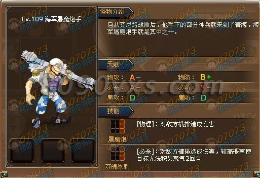怪物介绍:自从艾尼路战败后,他手下的部分神兵就来到了青海,海军屠魔炮手就是其中之一。