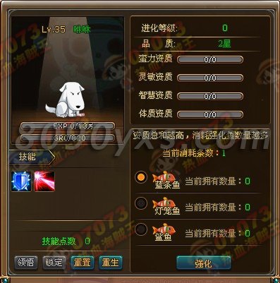 资质总和越多,消耗强化鱼数量越多,当前消耗条数1