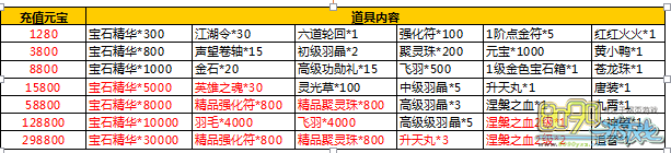 活动规则:活动期间,每个角色累计进行充值达1280、3800、8800、15800、58800、128800、298800元宝后,即可领取对应豪礼,机会难得!