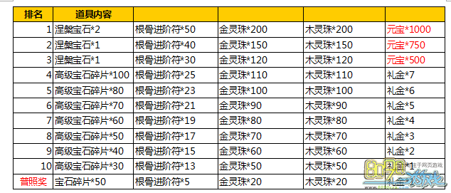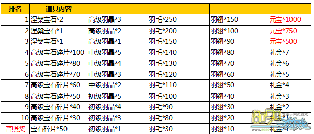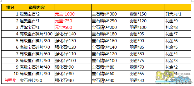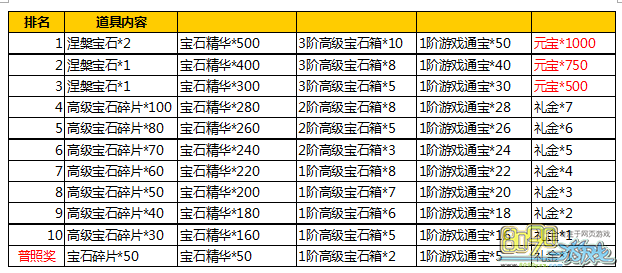 活动内容:活动时间内进入排行榜,结束后即可按相应排行领取奖励。(宝石评分超过2400分方可入榜单,宝石评分,例如涅槃之血100分,2级就是200分,其余橙色宝石80分,紫色30分,蓝色10分,绿色5分,白色一分)