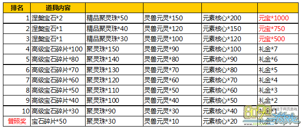活动内容:活动时间内进入排行榜,结束后即可按相应排行领取奖励。(玩家灵兽强化达到4阶方可进入榜单)