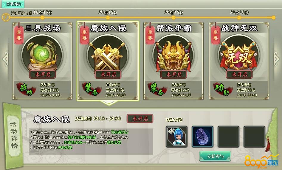 活动开始后,玩家进入魔族入侵的副本中,活动中会有大量的魔族来袭,击杀魔族小怪和魔族BOSS都可以获得相对于的积分,魔族小怪和魔族BOSS都会在副本地图中随机刷新,击杀的越多积分也会获得更多,击杀魔族BOSS时,伤害最高的玩家会获得额外的奖励,活动中可以用积分兑换初级升星石和一级宝石(宝石是随机获得一种属性)。当然魔族入侵也是纯在危险的,玩家可以随便杀人,不管是否组队或者在同一个帮会都是如此,比如你是BOSS伤害最高的,但是有玩家把你杀了并且你不是原地复活就拿不到奖励哦!但是如果能伤害最高拿到的奖励也是不一样的哦!所以富贵险中求也是如此!