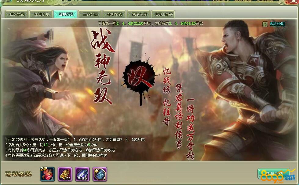 玩家只要达到70级在开服的第一周2、4、6和之后每周二、四、六晚上的21:10-21:40分参加活动。活动一共有五轮;第一轮十分钟,之后每轮五分钟。每轮最后一分钟开启突战,前三名的作为收方,剩余的玩家作为攻方,突战期间攻方每攻击一次获得两积分;击杀则获得二十积分,而守方击杀一名玩家获得两万经验,获得期间会有隐藏任务哦,完成会获得惊喜奖励。死亡不扣积分,守方死亡自动加入攻方阵营,直至守方奔溃,或者60秒没有全部死亡,守方奔溃则攻方胜利,守方没有全部死亡则守方胜利。守方奔溃积分按照死亡顺序排列,依次提高。守方胜利可以获得大量的积分,可以完成排名逆转!