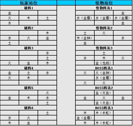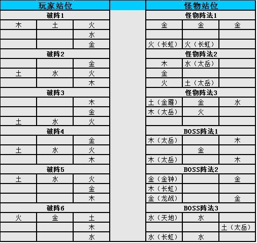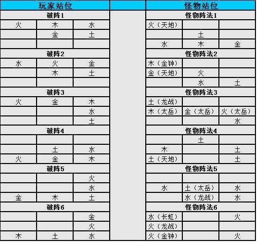 阵法中“金、木、水、火、土”为“五行系统”的5个属性(详细的“五行系统”信息可以参考官网的系统介绍)。怪物中标注有“(太岳)、(龙战)”等名称,表示怪物特有的战斗技能。