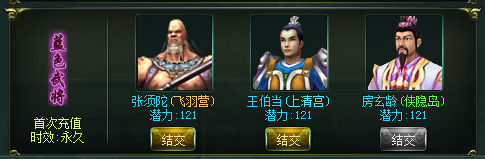 活动内容:只要玩家的角色是第一次在游戏里进行充值,除了丰厚的首充礼包,累计充值达到指定的额度,最高可达50%的返利大礼包倾情相送。高级首充令招募紫色武将、40级紫色装备套装,伴你称霸江湖!(紫色武将品质不可提升至橙色。)