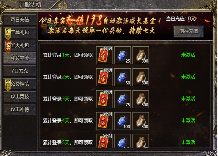 【活动内容】:活动期间充值达198元自动激活成长基金,激活后每天可领取基金奖励,持续7天