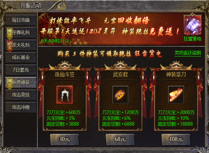 【活动内容】:活动期间购买刀刀元宝神装,开服第8天返还120%灵符!刀刀百万元宝,集齐5件领取狂雷紫电!