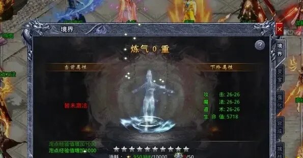 在游戏中,当玩家开服满15天及以上,且角色达到一定的等级之后,就可以开启境界系统的玩法了,玩家可以通过主界面下方的‘境界’图标,点击就可以进入到境界系统界面了,在境界系统界面之中,玩家可以通过消耗元宝和修炼值,来提升玩家自己的境界等级,当玩家将境界等级提升之后,可以获得属性效果,例如:攻击、魔法、道术、生命值的属性效果,若玩家想要获得修炼值的话,可以通过消耗元宝和灵符来购买修炼值,元宝每天可以购买3次,灵符每天可以购买30次,玩家赶紧去提升自己境界的等级吧。
