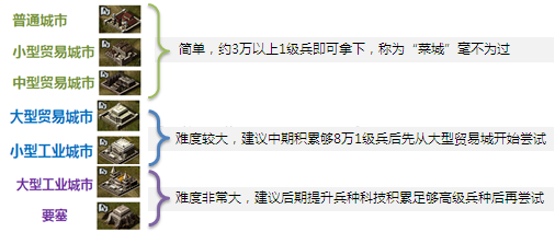 在占领富饶之地后,势力继续前进并占领大型贸易城市及小型工业城市,并在此开设分基地,囤积兵力,以达到进可攻退可守的趋势。富饶之地的每个区域内都有十几个普通城市,普通城市是比较容易占领的,只要玩家势力拥有22500+的兵力即可前往攻打,而在攻打过程中,可以使用以下方法,获得特殊攻防加成: