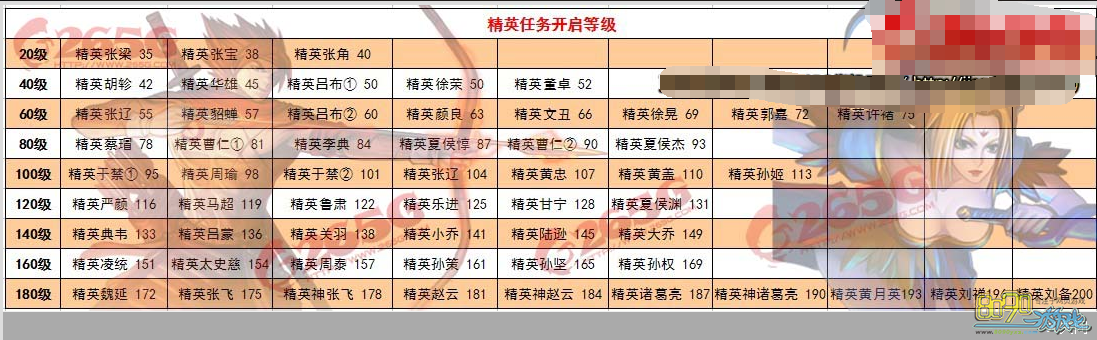 6 0 级:精英张辽55 精英貂蝉57 精英吕布60 精英颜良63 精英文丑66 精英徐晃69 精英郭嘉72 精英许褚75