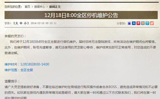 12月18日8:00-14:00进行全区全服维护,不要在临近维护时在商城进行购买操作或者击杀BOSS,避免造成异常情况和不必要的损失。
