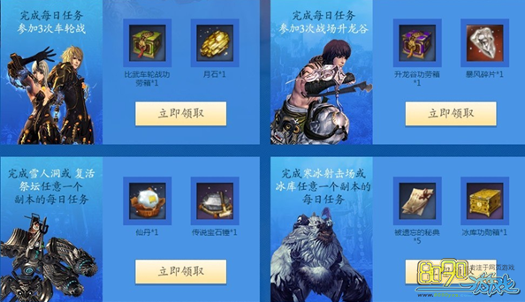 在活动期间只要每天完成下列图片中的一个任务,第二天就可以获得页面领取每日任务奖励。PS:每天只能领取一个福利礼包~