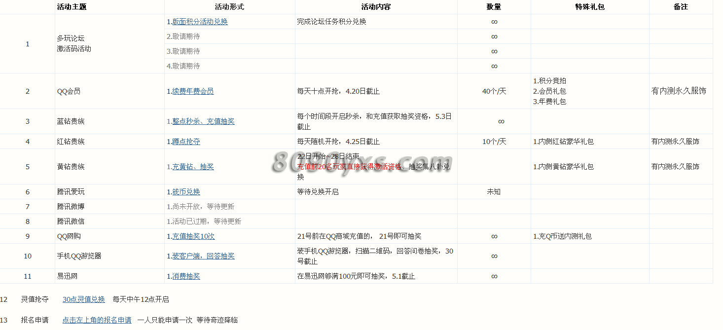| 8 | QQ网购 | 1.充值抽奖10次 | 21号前在QQ商城充值的, 21号即可抽奖 | ∞ | 1.充Q币送内测礼包 | |