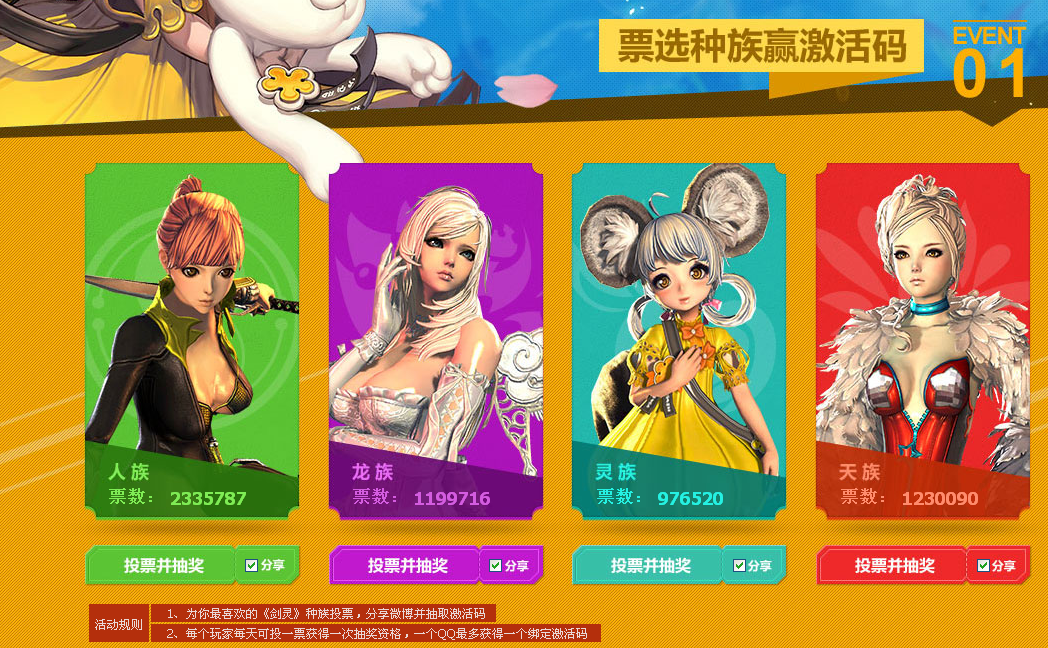 活动规则 1、为你最喜欢的剑灵种族投票,分享微博并抽取激活码