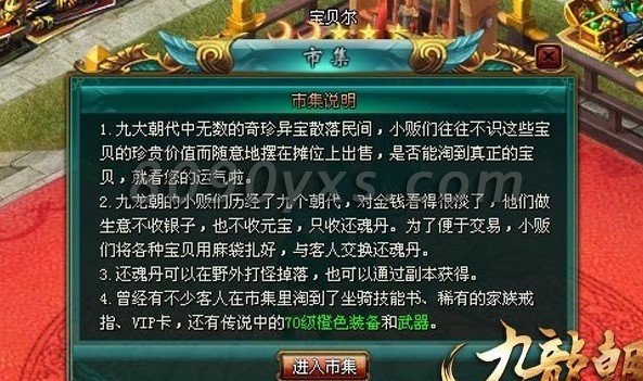 当九龙朝玩家等级达到33级左右,并且完成主线任务,便会开启装备市集系统。九龙朝中无数的奇珍异宝散落民间,小贩们往往不识这些宝贝的珍贵价值而随 意地摆在摊位上出售。但是历经了九个朝代的他们,对金钱看得很淡很淡。他们做生意不收银子,也不要元宝。他们只要可以原地复活的还魂丹。只需使用九龙朝还 魂丹即可在市集中淘到坐骑技能书、稀有的家族戒指以及VIP卡,更有传说中的70级橙色装备和武器哦。