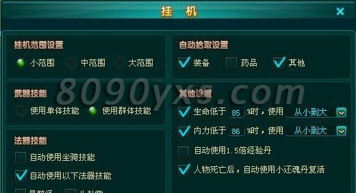 由于解封神器所需要的碎片数量庞大,要收集够足够的碎片将耗费大量的时间。合理使用挂机功能将省去很大麻烦,值得一提的是,挂机功能界面有自动拾取选 项,启用后将自动拾取野怪爆出的道具!不过,《九龙朝》的怪物都非常“大方”,他们会不断的爆装备,所以为了不让装备填满你的行囊,舍弃“装备”装备选项 吧;勾选 “其他”选项就行,这样系统就将只会自动拾取神器碎片与银两啦,是不是很贴心?