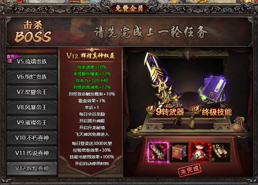 君临传奇分为免费会员和蓝钻贵族,免费会员通过完成击杀BOSS解锁贵族权益,如果您已经达到VIP12说明已完全解锁免费会员;