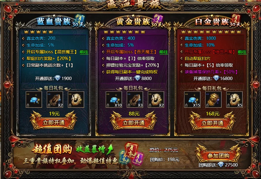 而蓝钻贵族需要充值活动,以下是充值档位以及收益说明
