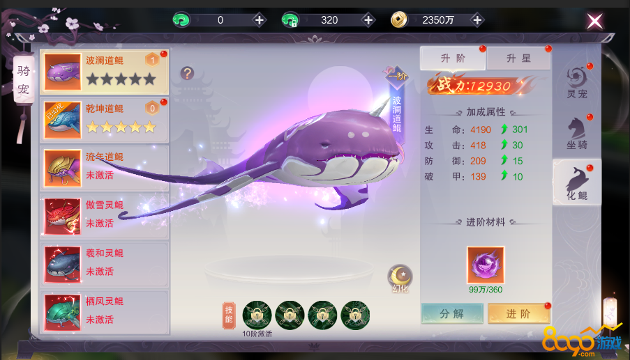 鲲的技能: 鲲到达一定阶数后可解锁被动技能,提升大量战力。