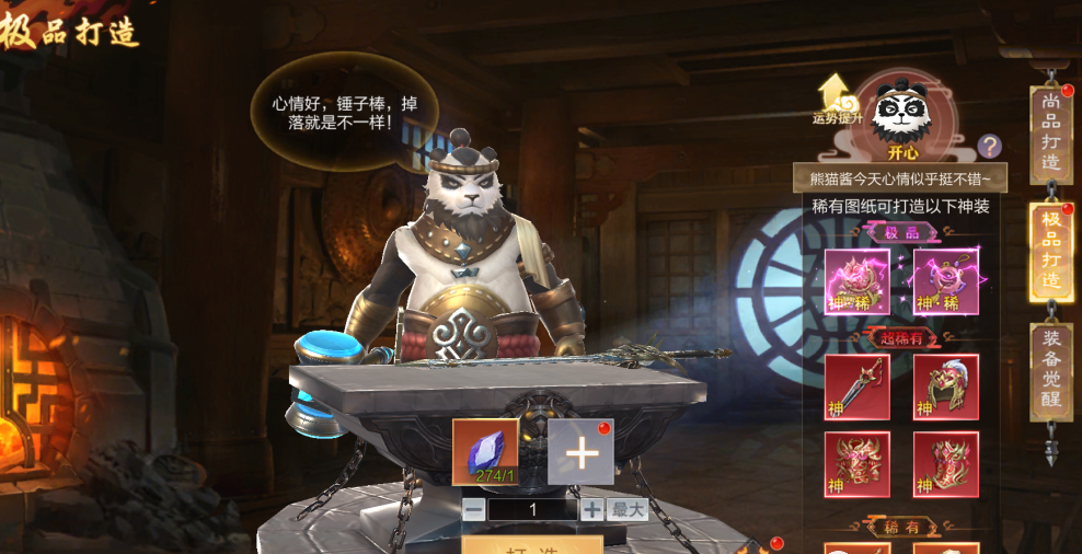首先,我们进入熊猫铁匠系统,可以看到这里有两个锻造炉供我们选择:尚品打造和极品打造。尚品打造可以为我们提供一系列品质上乘的装备,而极品打造则更是让人期待,因为它有可能打造出极品圣装,让我们的天神实力大增。