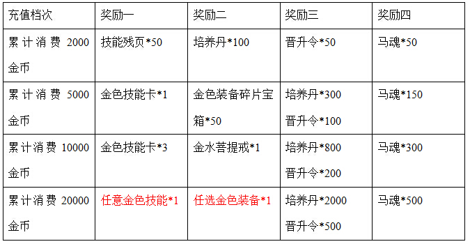 例:小明在10号至13号累计消费2万金币,可获得累计消费2000至2万金币档次奖励各一份。