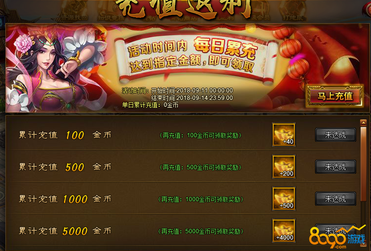活动内容:活动期间单日累计充值达到指定金额即可领取丰厚金币返利。