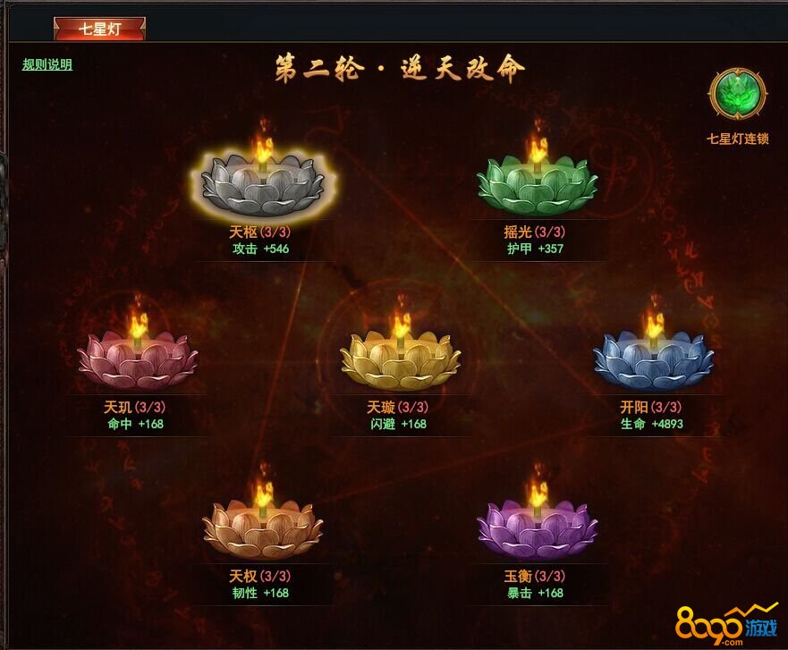 搜索"8090网页游戏"在三国演义里,孔明利用七星灯来祈福自己延年益寿,可惜最后功亏一篑。军师联盟为了还原原著的各个细节,也将此加入游戏之中。在游戏主界面右下角成长系统一栏中可以找到七星灯按钮。