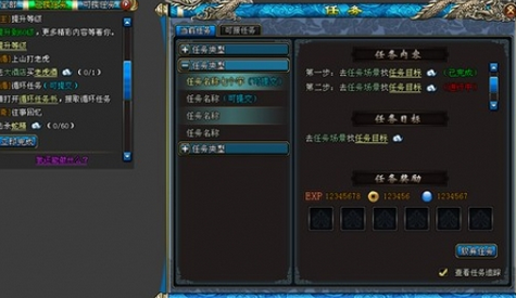 主线任务:叙述游戏故事背景,贯穿整个游戏,始终陪伴玩家成长,是玩家必须完成的任务,从1级开始贯穿始终。同样也是前期获得必要装备、物品、经验和历练的唯一途径。