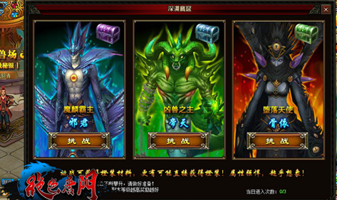 橙装是绝色唐门中最顶级的一类装备了,一套橙装除了需要人品之外,还要大量的材料升级。而在游戏中有一个名为深渊魔窟的副本,这可是大家获得橙装的快速方便的途径哦。在绝色唐门中,深渊魔窟共分为三种模式,分别是魔麟霸主邪君、凶兽之主帝天以及堕落天使骨依,这三种模式难度会不断攀升,当然掉落物也逐渐稀有,每日每个玩家只能进入3次,所以小伙伴们一定要珍惜哦!邪君是出生灵套装、帝天是出光明套装、骨依是出海神套装。